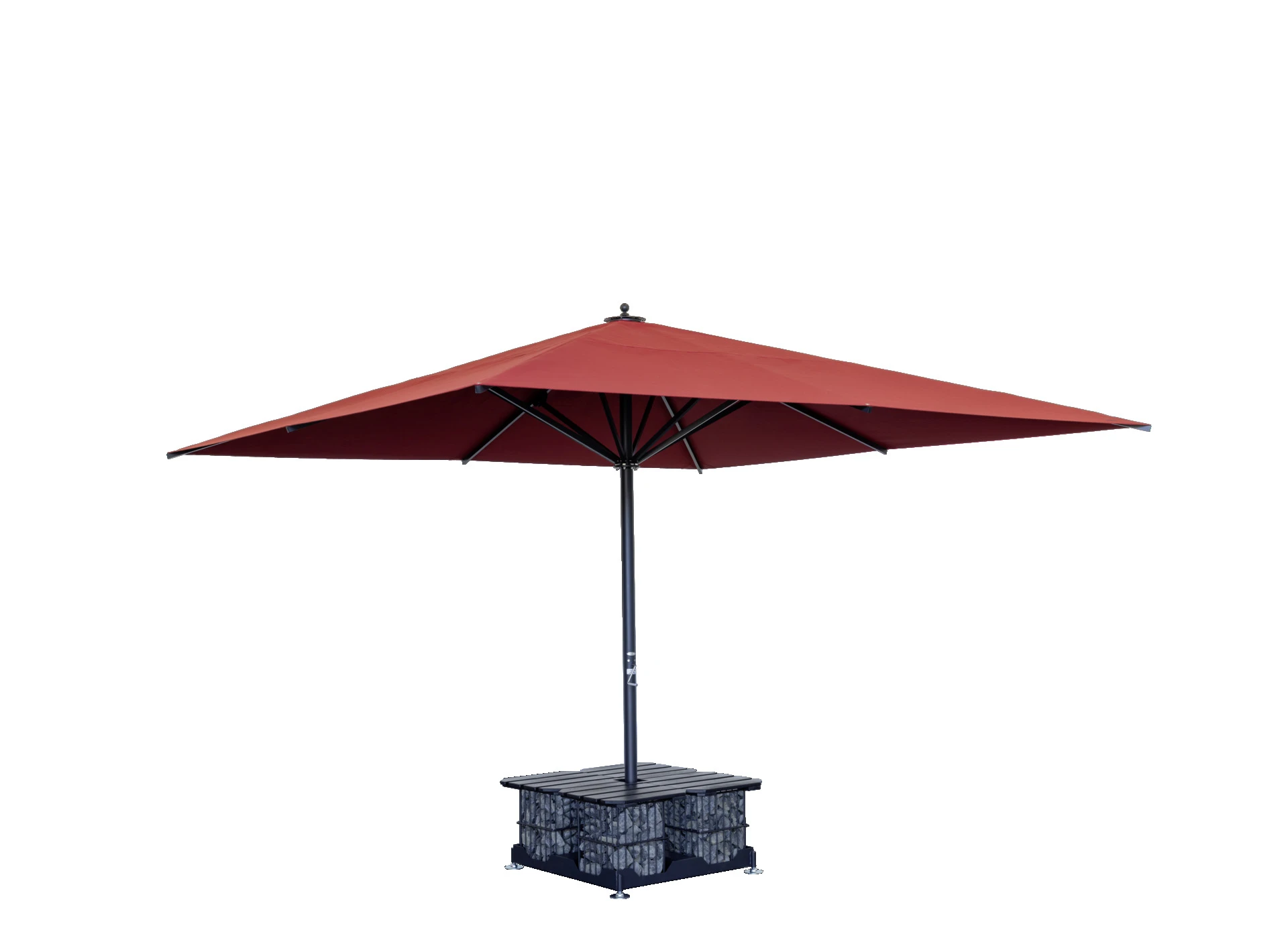 Der Mittelmastschirm Centro ist ein solider Schattenspender für Schirmgrößen bis zu 5 m Spannweite. Bestens geeignet in Biergärten und auf Terrassen in der Gastronomie. (Abbildungen links mit Schirmständer Multicube)